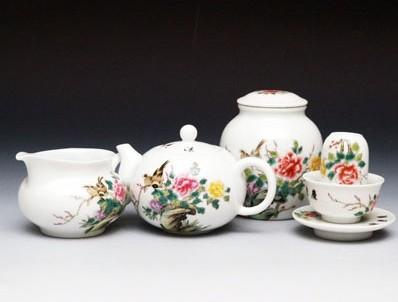 瓷器茶具我國茶具最早以陶器為主。瓷器發明之后,陶質茶具就逐漸為瓷器茶具所代替分為白瓷茶具、青瓷茶具和黑瓷茶具等。其一,白瓷茶具;白瓷以景德鎮的瓷器最為著名,其它如湖南的、河北唐山的也各具特色。景德鎮原名昌南鎮,北宋景德三年(公元1004年真宗趙恒下鎮建辦御窯,并把昌南鎮改名為景德鎮。到元代,景德鎮的青花瓷聞名于世)其二,青瓷茶具;青瓷茶具晉代開始發展,那時青瓷的主要產地在浙江,最流頭流子的有嘴茶壺。宋朝時五大名窯之一的浙江龍泉哥窯達到了鼎盛時期,器包括茶壺、茶碗、茶杯、茶盤等,甄江兩岸盛況空前,群窯林立煙火往返如梭,一派繁榮。
